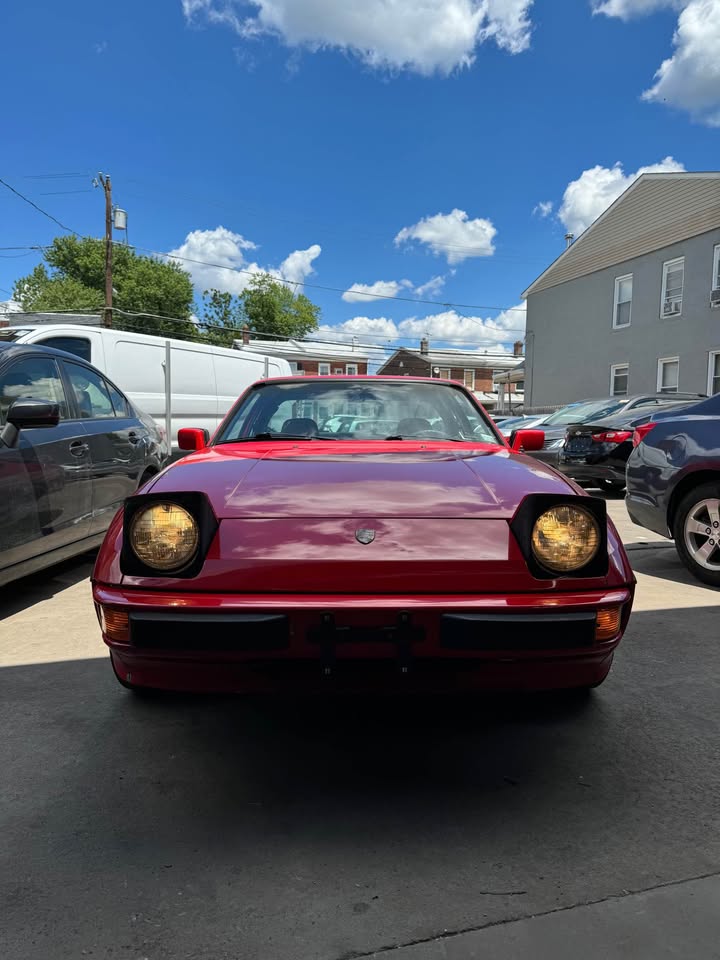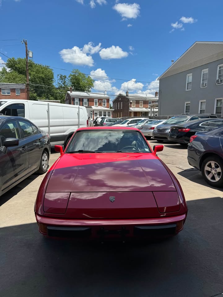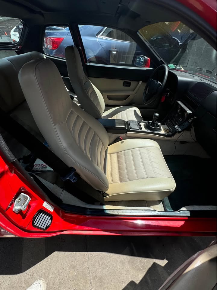 Powered by a 2.5L engine from the 944, paired with a manual transmission. Known for excellent handling and balance. Red exterior with beige interior.